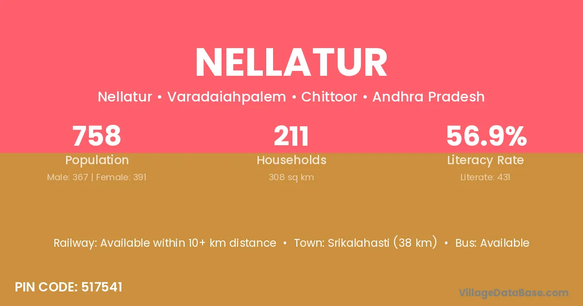 Srikalahasti (38 km) is the nearest town to Nellatur village for major economic activities and is located approximately 38 km away.