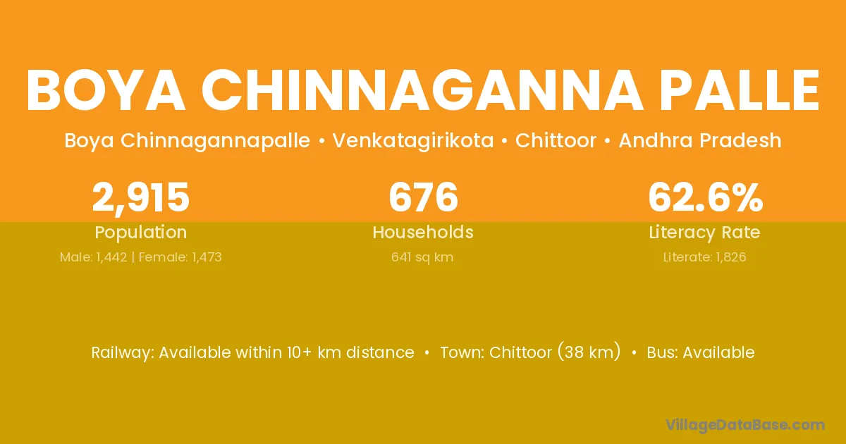 Chittoor (38 km) is the nearest town to Boya Chinnaganna Palle village for major economic activities and is located approximately 38 km away.