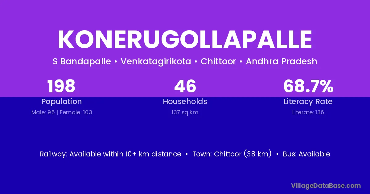 Konerugollapalle village has a total population of 198 people, of which 95 are males and 103 are females.