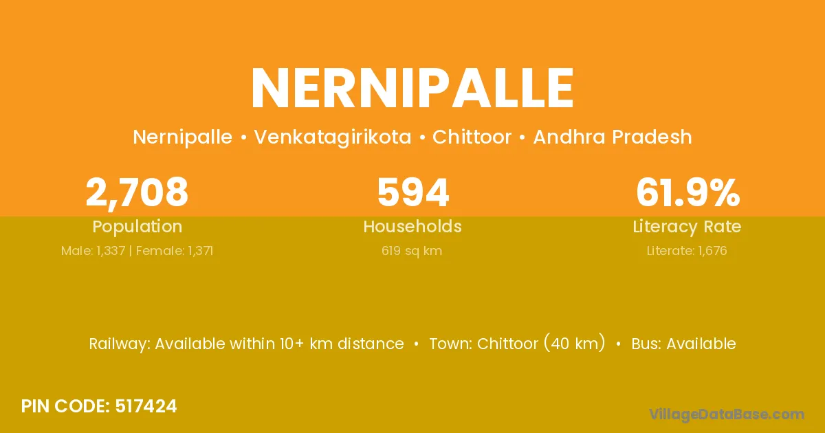 Chittoor (40 km) is the nearest town to Nernipalle village for major economic activities and is located approximately 40 km away.