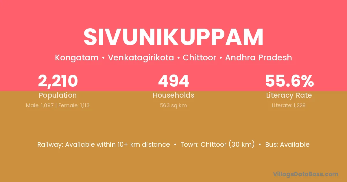 Chittoor (30 km) is the nearest town to Sivunikuppam village for major economic activities and is located approximately 30 km away.