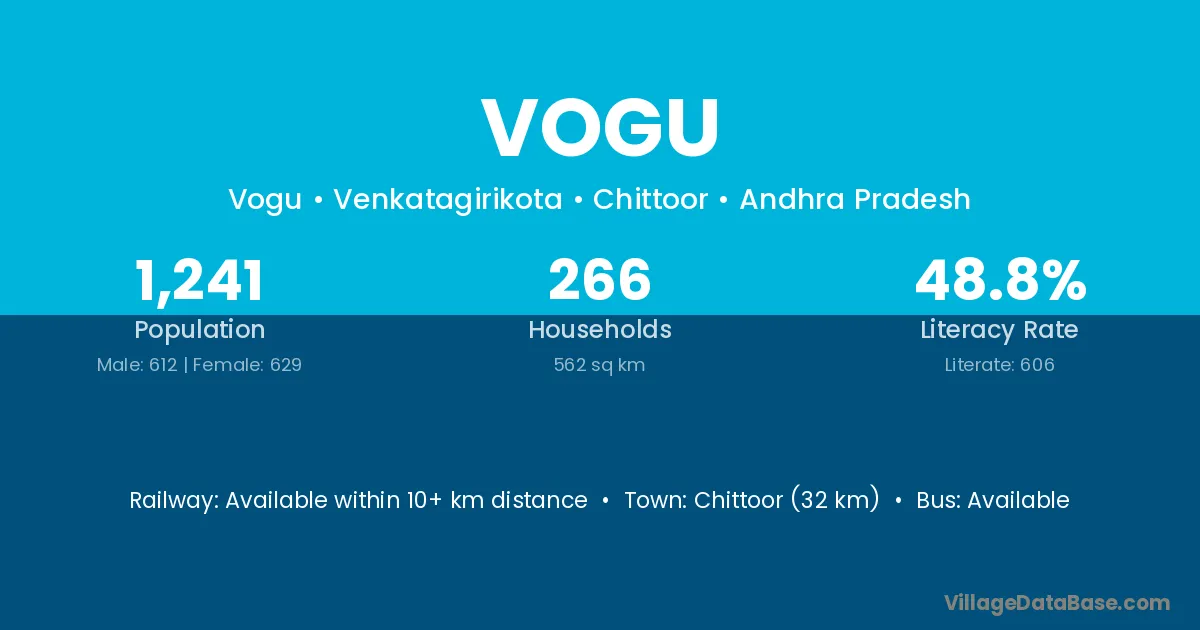 Chittoor (32 km) is the nearest town to Vogu village for major economic activities and is located approximately 32 km away.