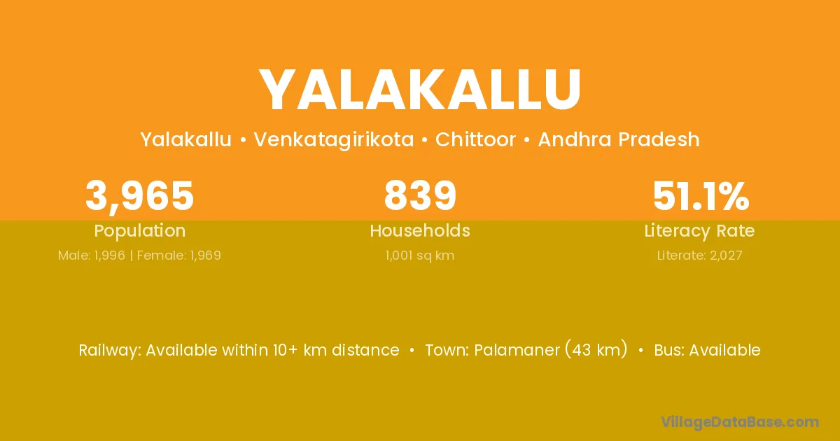 Palamaner (43 km) is the nearest town to Yalakallu village for major economic activities and is located approximately 43 km away.