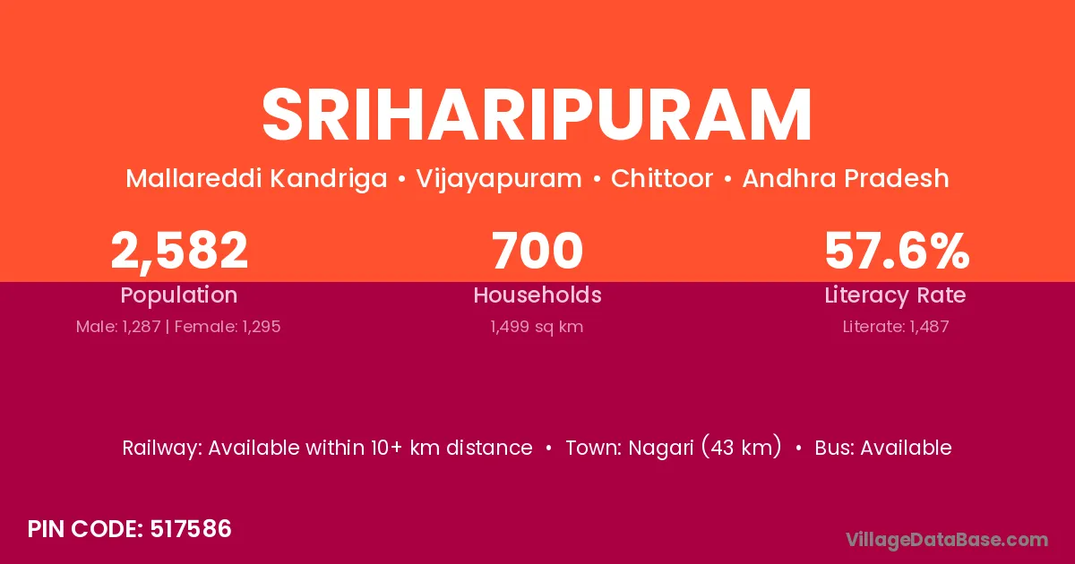 Nagari (43 km) is the nearest town to Sriharipuram village for major economic activities and is located approximately 43 km away.