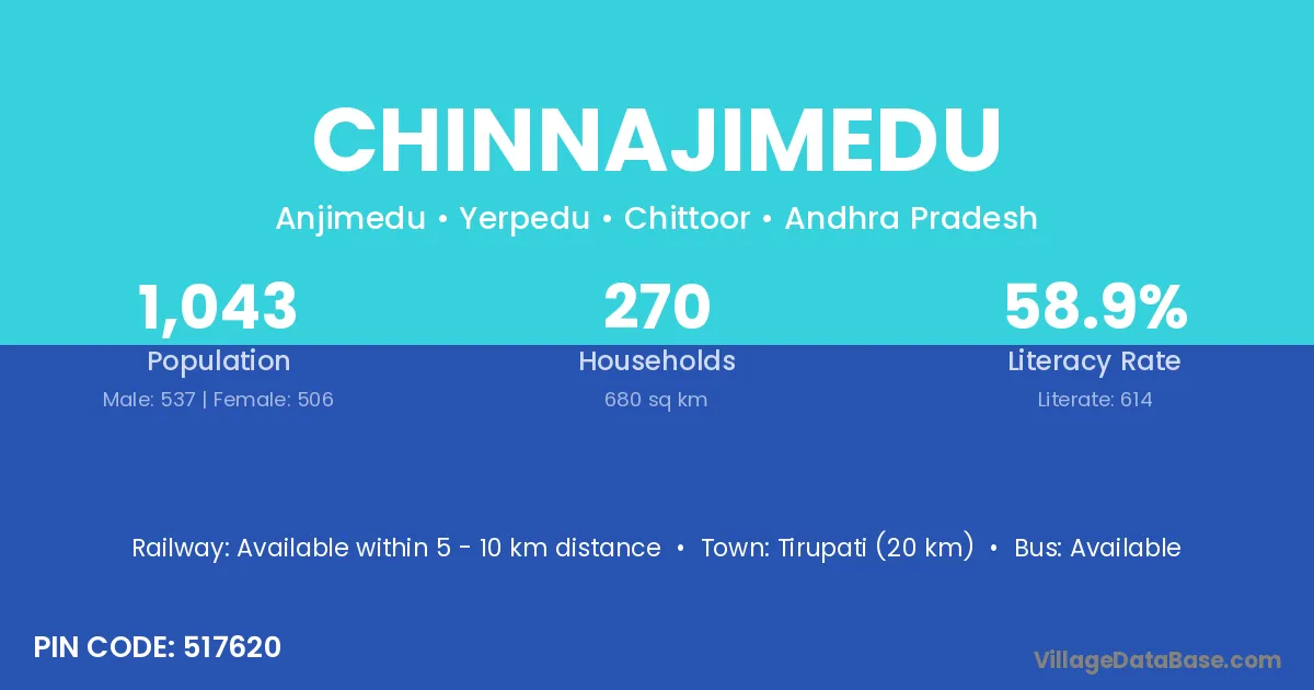 Chinnajimedu village has a total population of 1,043 people, of which 537 are males and 506 are females.