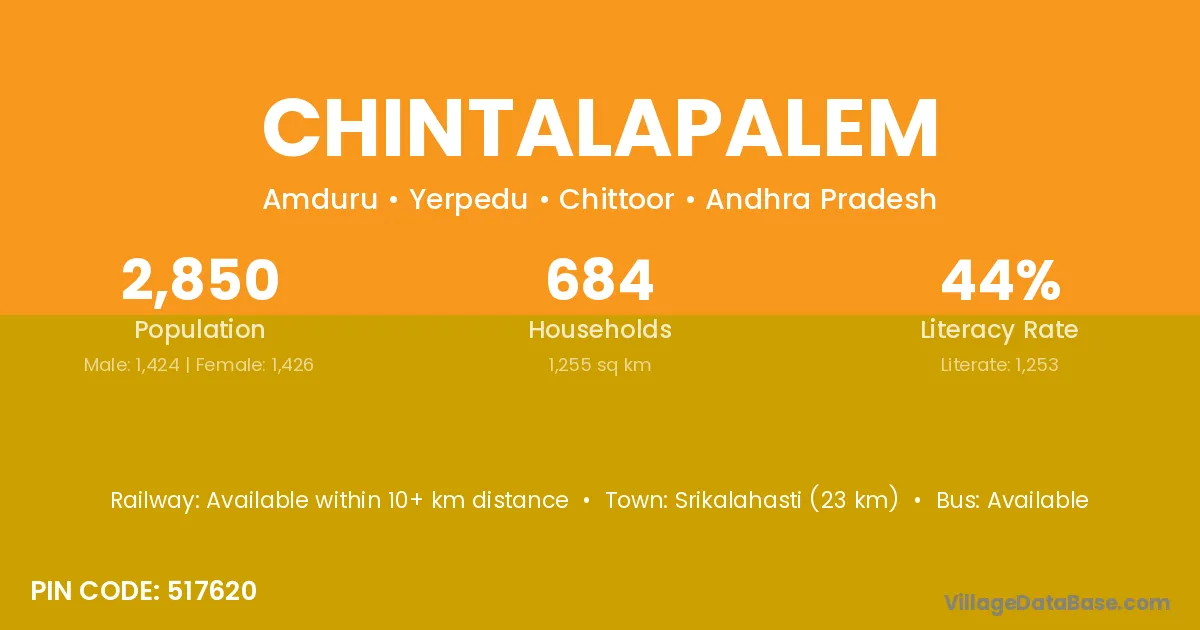 Srikalahasti (23 km) is the nearest town to Chintalapalem village for major economic activities and is located approximately 23 km away.