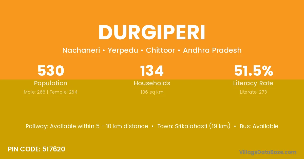 Srikalahasti (19 km) is the nearest town to Durgiperi village for major economic activities and is located approximately 19 km away.