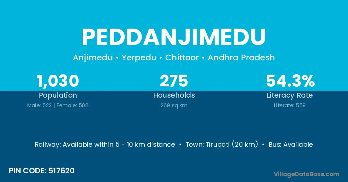 Tirupati (20 km) is the nearest town to Peddanjimedu village for major economic activities and is located approximately 20 km away.