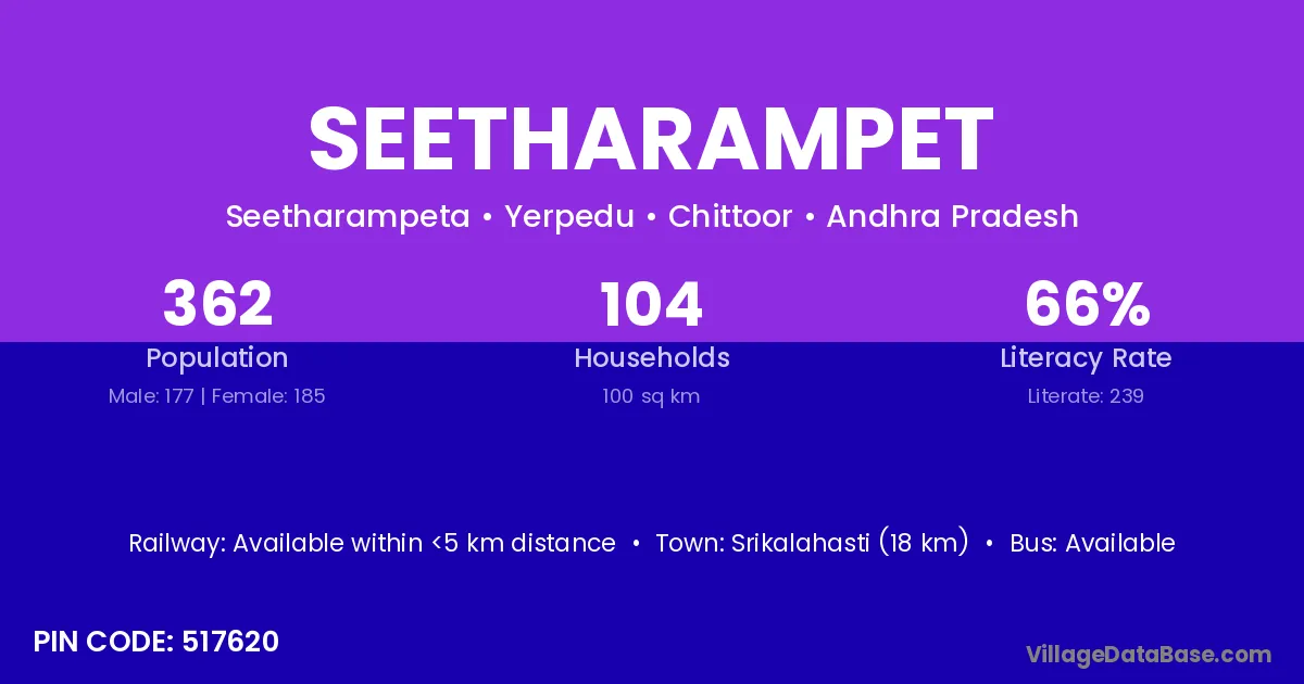 Srikalahasti (18 km) is the nearest town to Seetharampet village for major economic activities and is located approximately 18 km away.