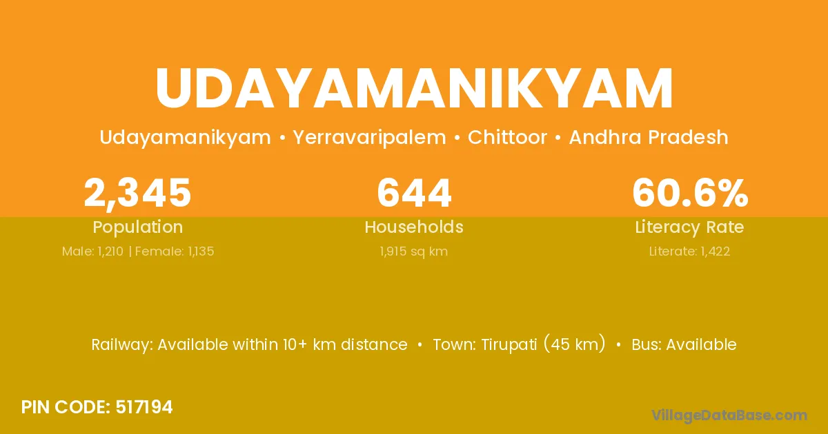 Tirupati (45 km) is the nearest town to Udayamanikyam village for major economic activities and is located approximately 45 km away.