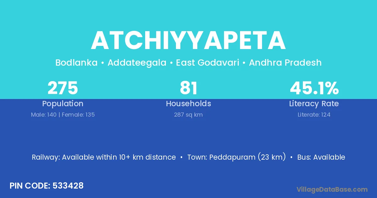 Peddapuram (23 km) is the nearest town to Atchiyyapeta village for major economic activities and is located approximately 23 km away.