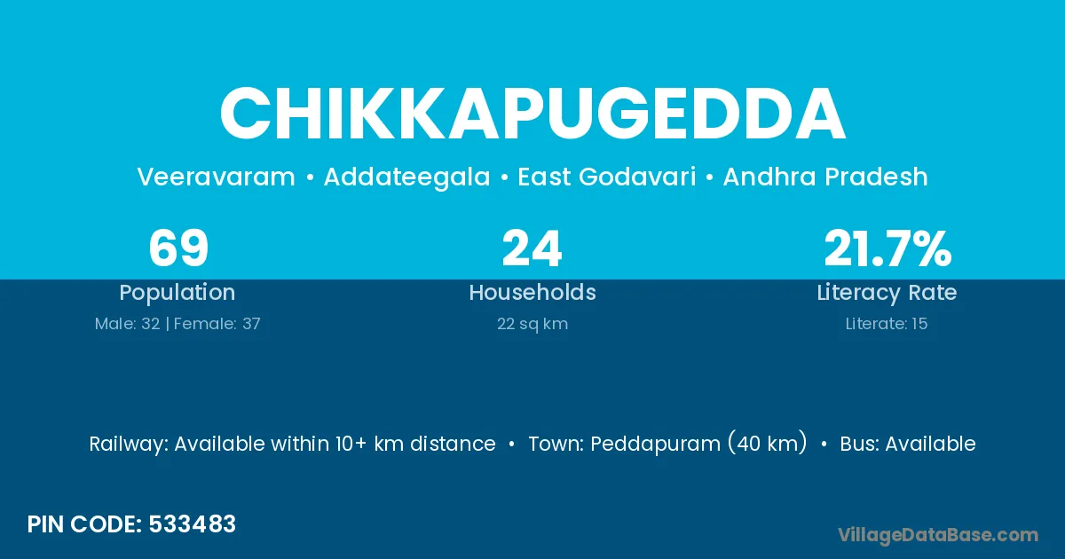 Peddapuram (40 km) is the nearest town to Chikkapugedda village for major economic activities and is located approximately 40 km away.