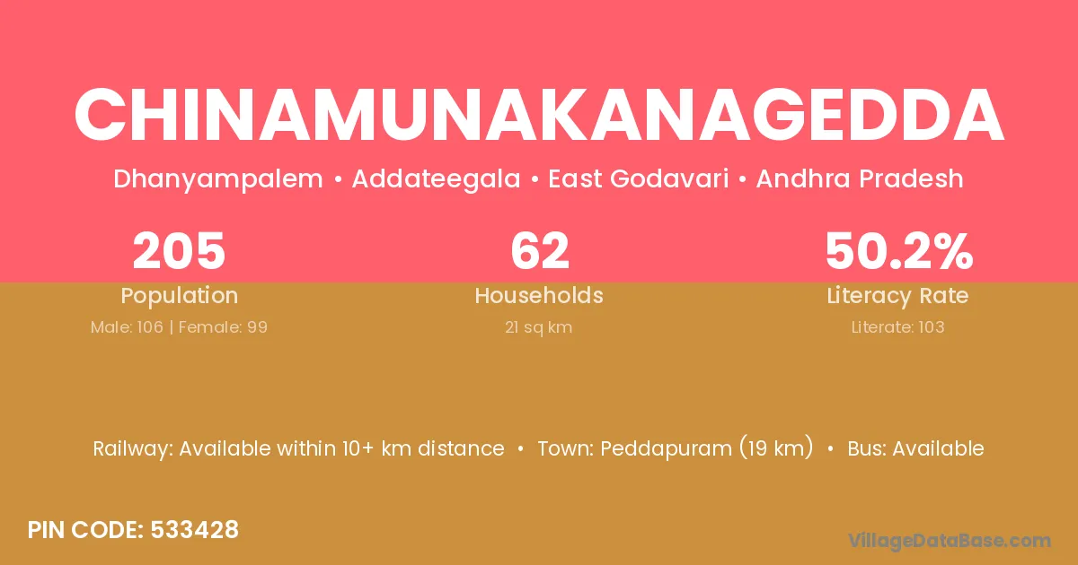 Chinamunakanagedda village has a total population of 205 people, of which 106 are males and 99 are females.