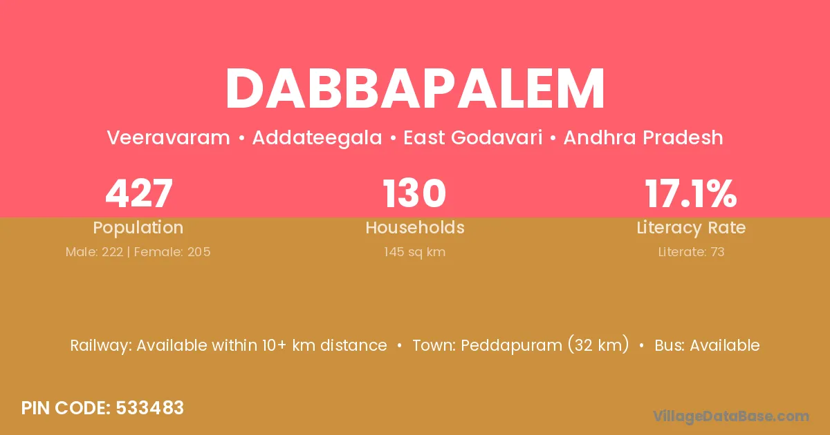 Dabbapalem village has a total population of 427 people, of which 222 are males and 205 are females.