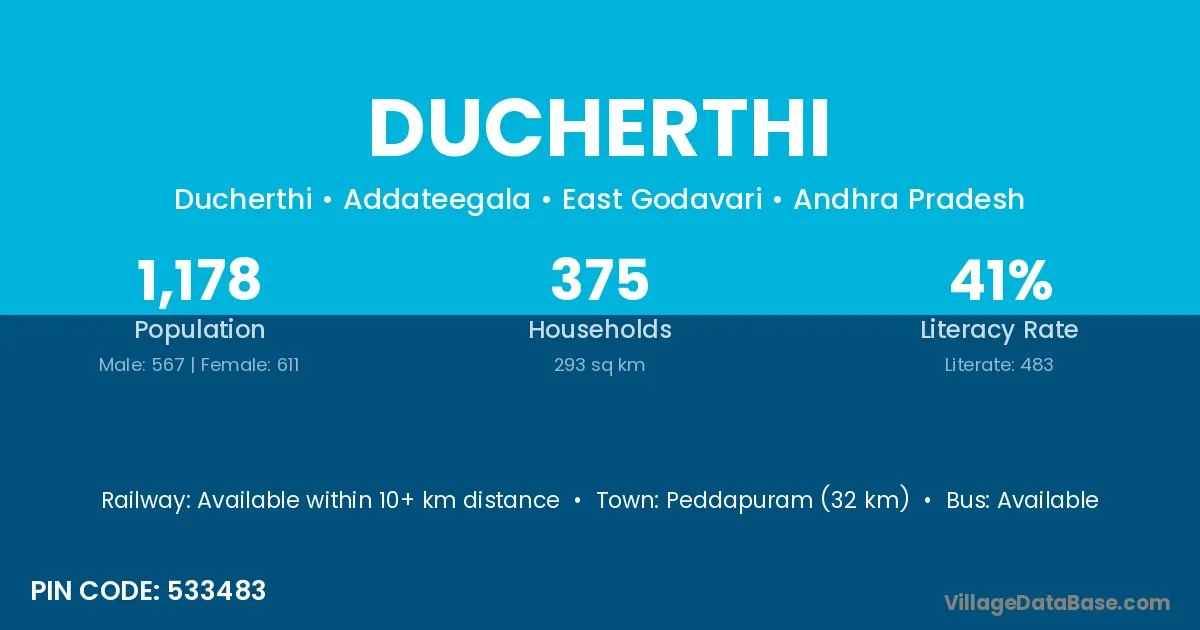 Peddapuram (32 km) is the nearest town to Ducherthi village for major economic activities and is located approximately 32 km away.