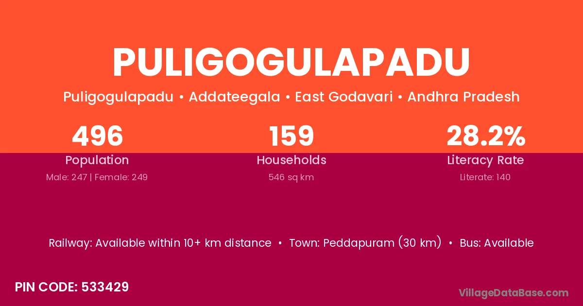 Peddapuram (30 km) is the nearest town to Puligogulapadu village for major economic activities and is located approximately 30 km away.