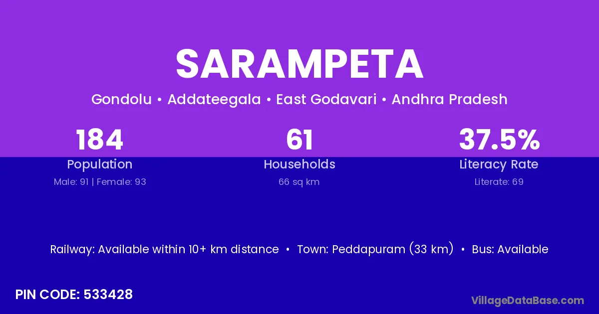 Peddapuram (33 km) is the nearest town to Sarampeta village for major economic activities and is located approximately 33 km away.