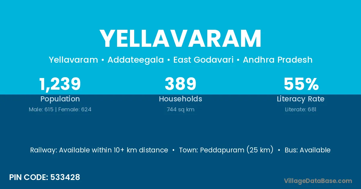 Peddapuram (25 km) is the nearest town to Yellavaram village for major economic activities and is located approximately 25 km away.