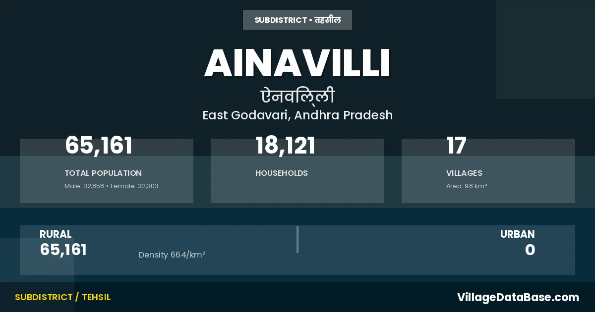 According to the 2011 census The total area of Ainavilli Mandal is 98 km², with a population of 65161 people. The population density is 664 inhabitants per square kilometre, and there are approximately 18121 houses in the sub district.