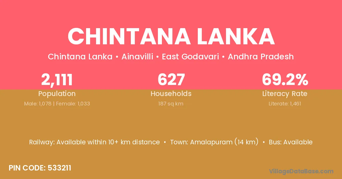 Amalapuram (14 km) is the nearest town to Chintana Lanka village for major economic activities and is located approximately 14 km away.