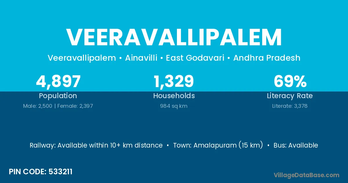 Amalapuram (15 km) is the nearest town to Veeravallipalem village for major economic activities and is located approximately 15 km away.