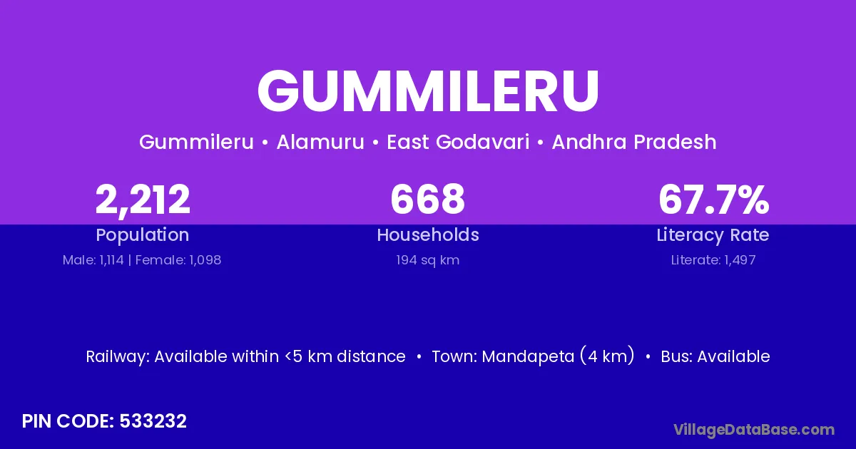 Mandapeta (4 km) is the nearest town to Gummileru village for major economic activities and is located approximately 4 km away.