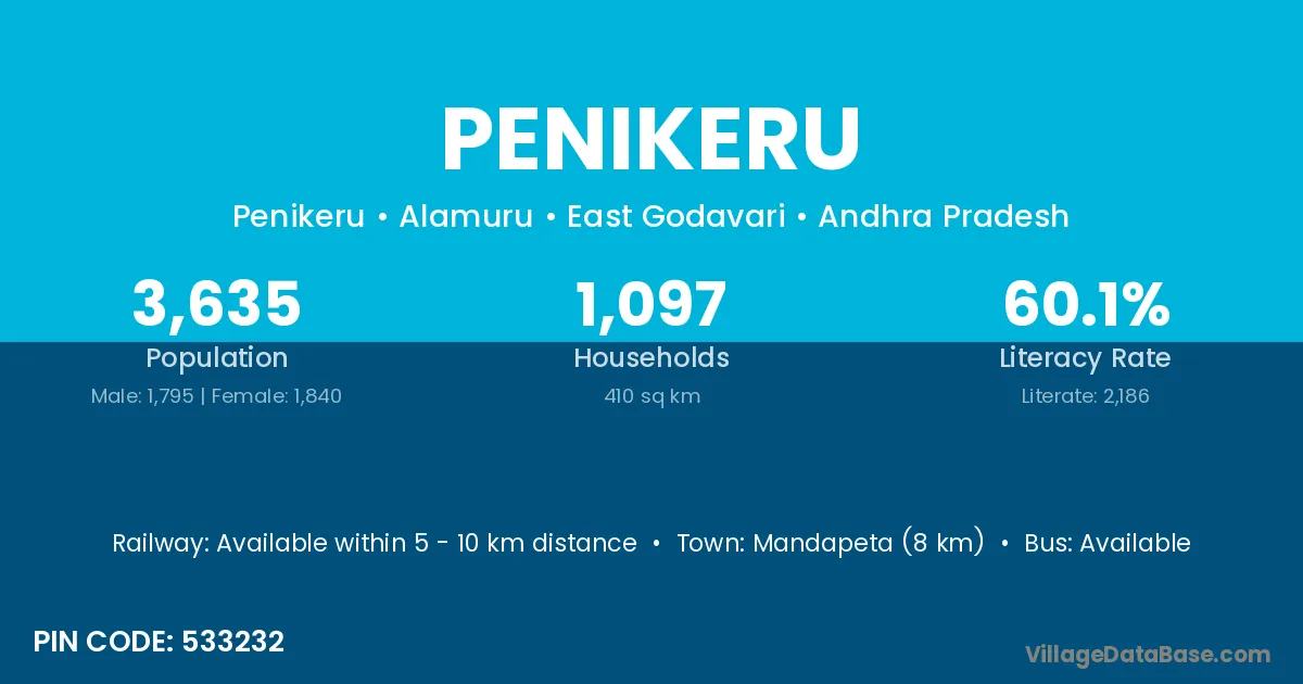 Mandapeta (8 km) is the nearest town to Penikeru village for major economic activities and is located approximately 8 km away.