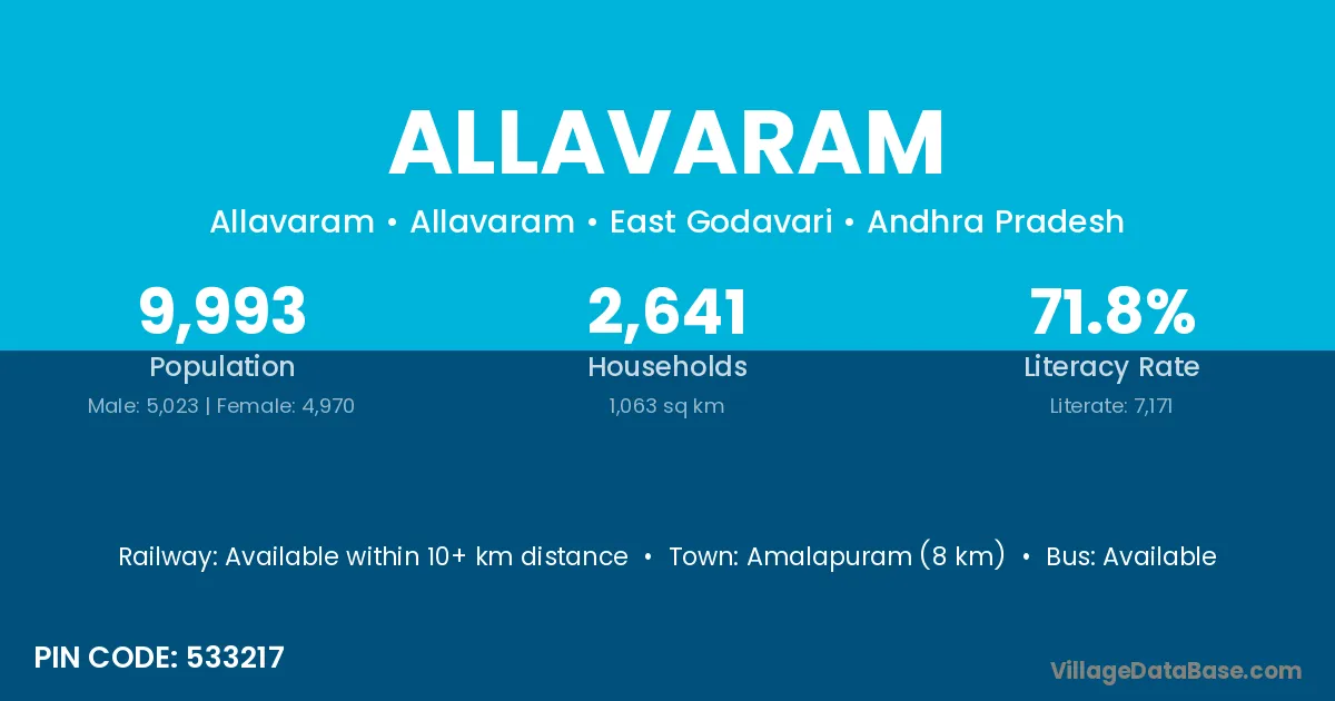 Amalapuram (8 km) is the nearest town to Allavaram village for major economic activities and is located approximately 8 km away.