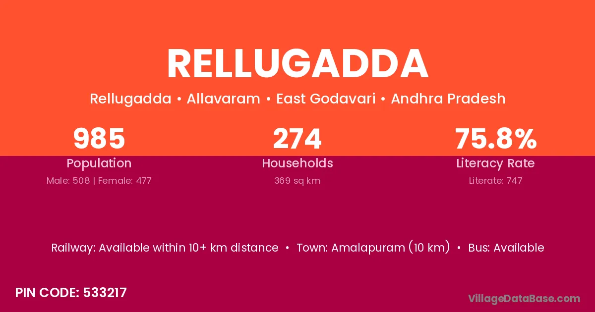 Amalapuram (10 km) is the nearest town to Rellugadda village for major economic activities and is located approximately 10 km away.