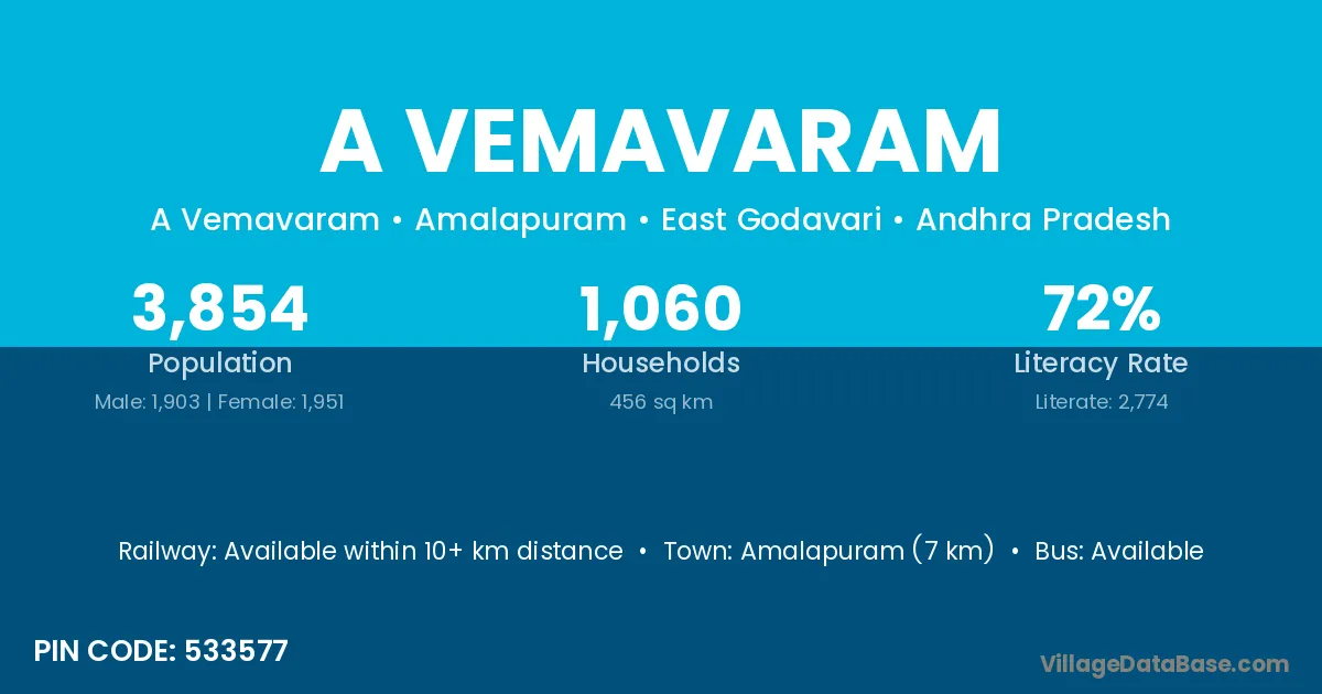 Amalapuram (7 km) is the nearest town to A Vemavaram village for major economic activities and is located approximately 7 km away.