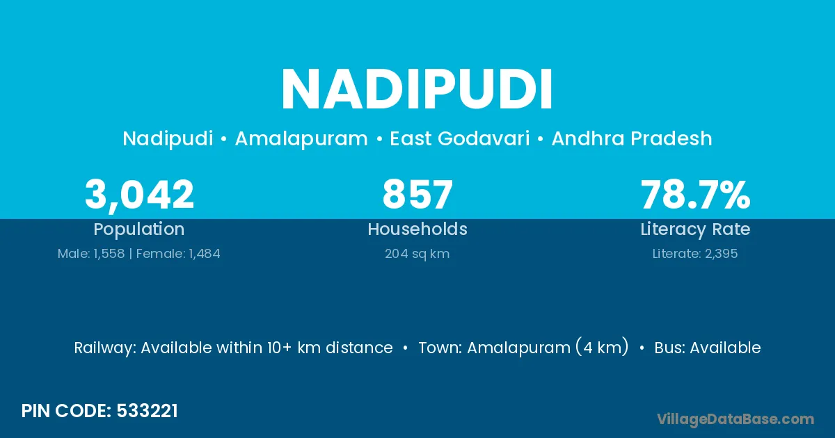 Amalapuram (4 km) is the nearest town to Nadipudi village for major economic activities and is located approximately 4 km away.
