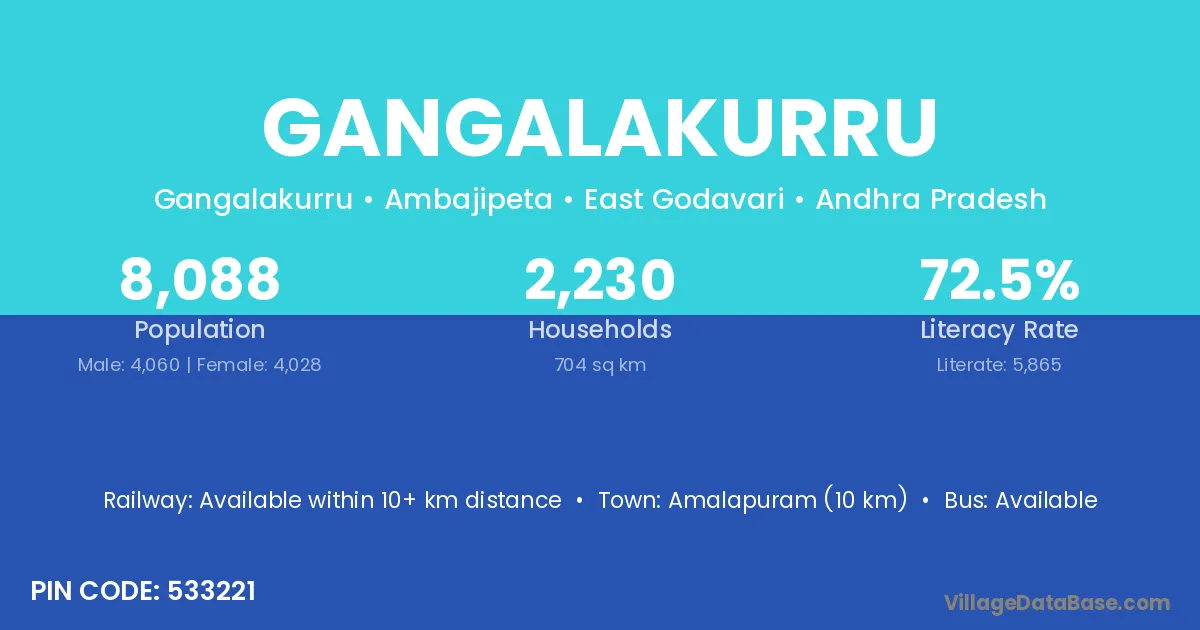 Amalapuram (10 km) is the nearest town to Gangalakurru village for major economic activities and is located approximately 10 km away.