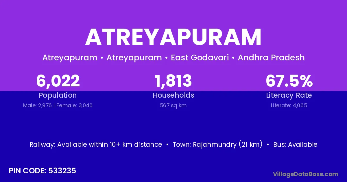 Atreyapuram village has a total population of 6,022 people, of which 2,976 are males and 3,046 are females.