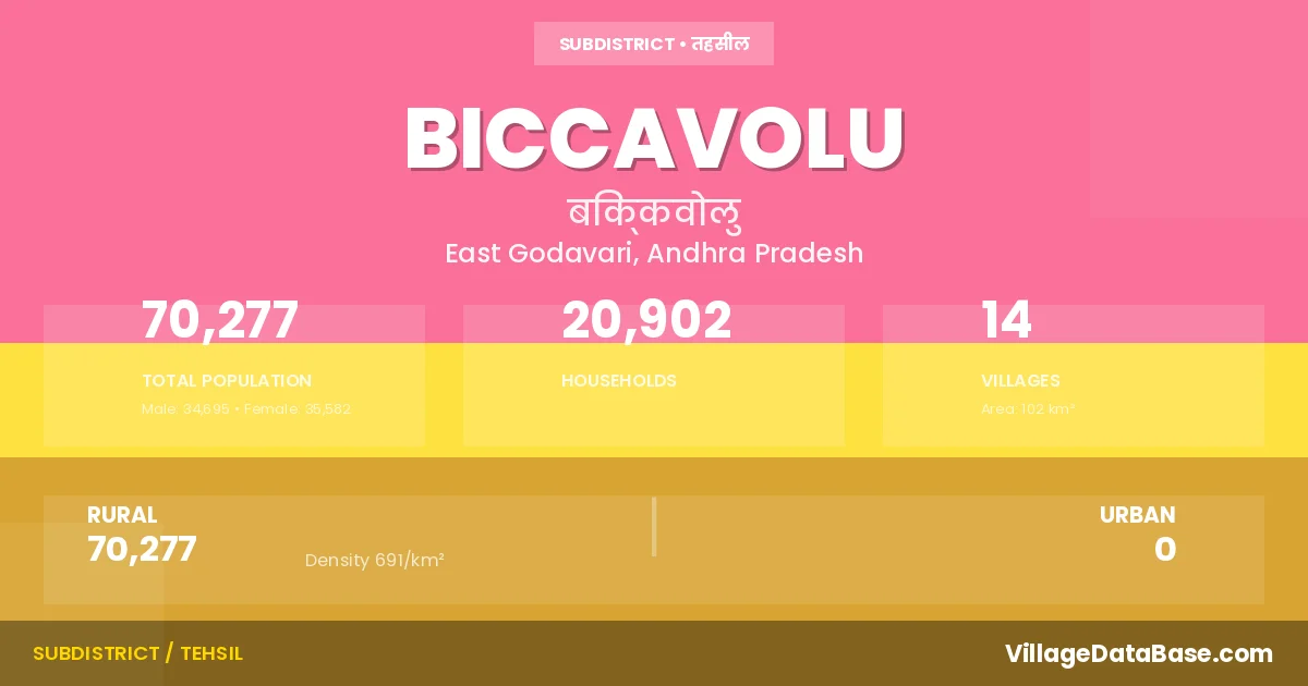 According to the 2011 census The total area of Biccavolu Mandal is 102 km², with a population of 70277 people. The population density is 691 inhabitants per square kilometre, and there are approximately 20902 houses in the sub district.