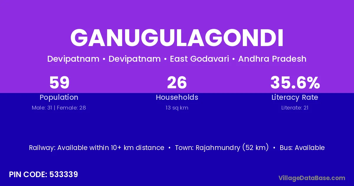 Rajahmundry (52 km) is the nearest town to Ganugulagondi village for major economic activities and is located approximately 52 km away.