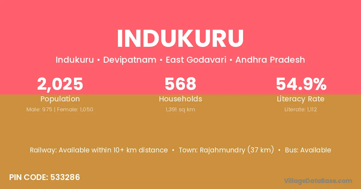 Indukuru village has a total population of 2,025 people, of which 975 are males and 1,050 are females.