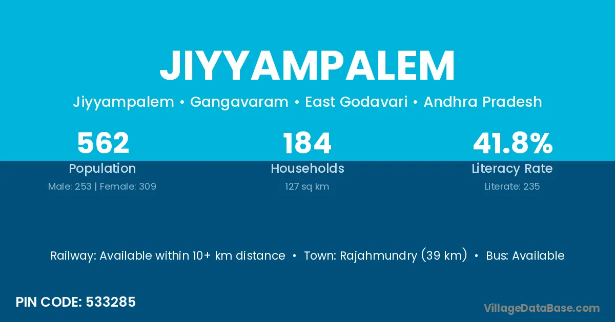 Rajahmundry (39 km) is the nearest town to Jiyyampalem village for major economic activities and is located approximately 39 km away.
