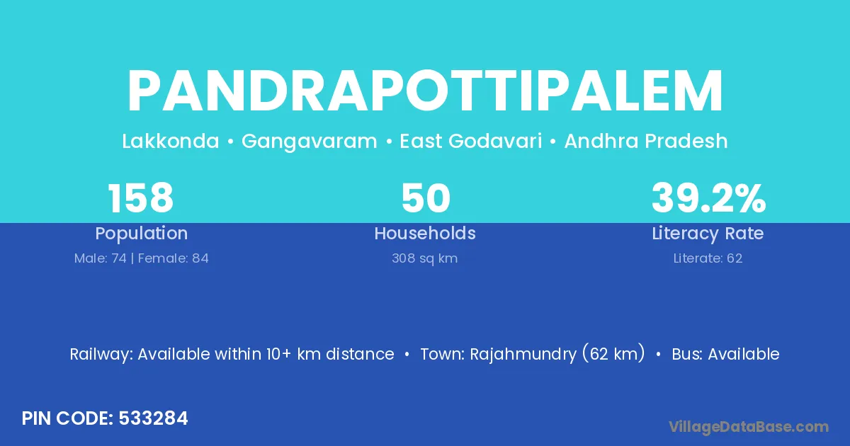Rajahmundry (62 km) is the nearest town to Pandrapottipalem village for major economic activities and is located approximately 62 km away.