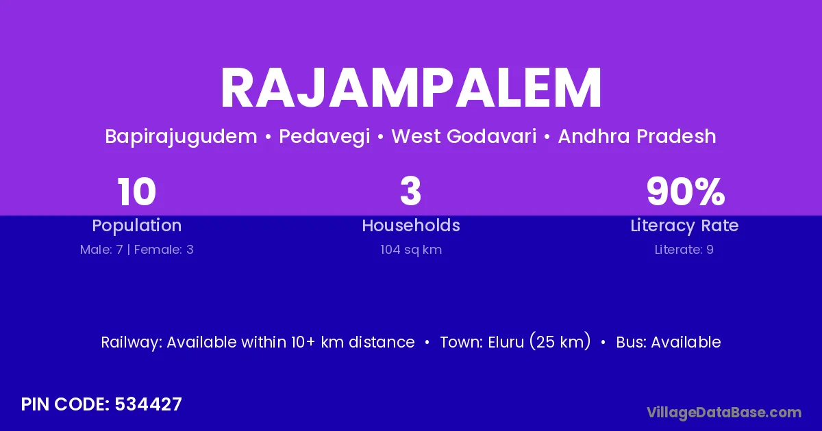 Rajahmundry (62 km) is the nearest town to Rajampalem village for major economic activities and is located approximately 62 km away.