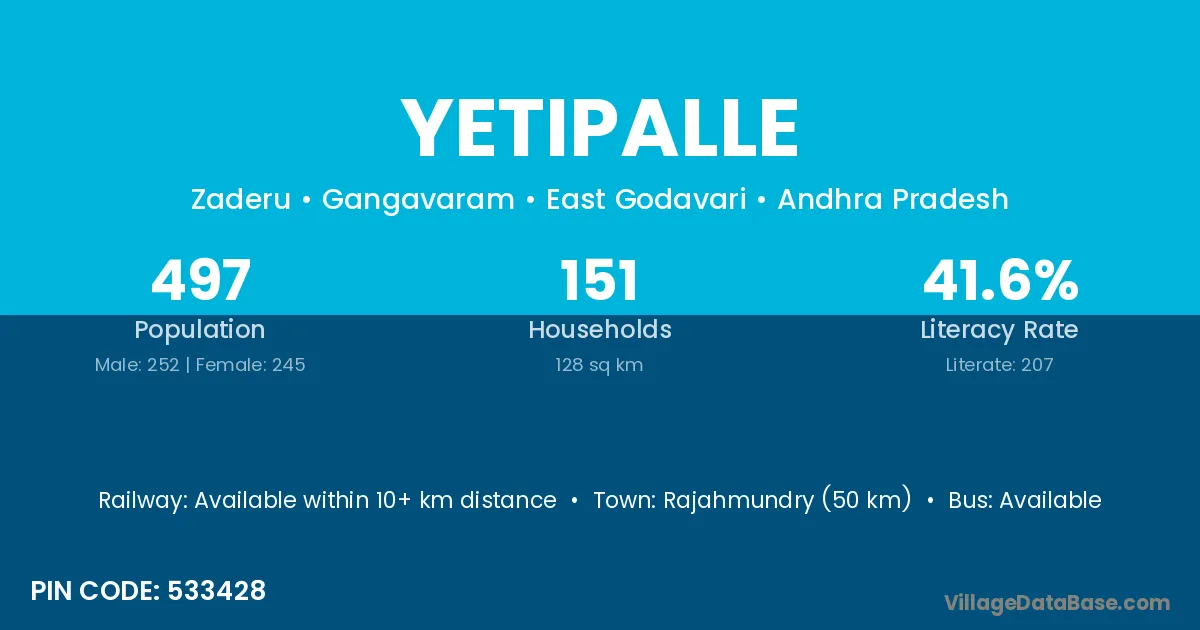 Rajahmundry (50 km) is the nearest town to Yetipalle village for major economic activities and is located approximately 50 km away.
