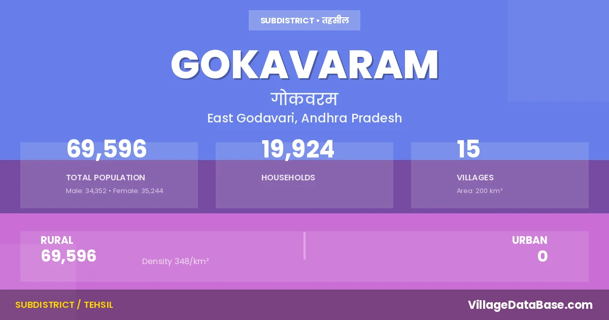 According to the 2011 census The total area of Gokavaram Mandal is 200 km², with a population of 69596 people. The population density is 348 inhabitants per square kilometre, and there are approximately 19924 houses in the sub district.