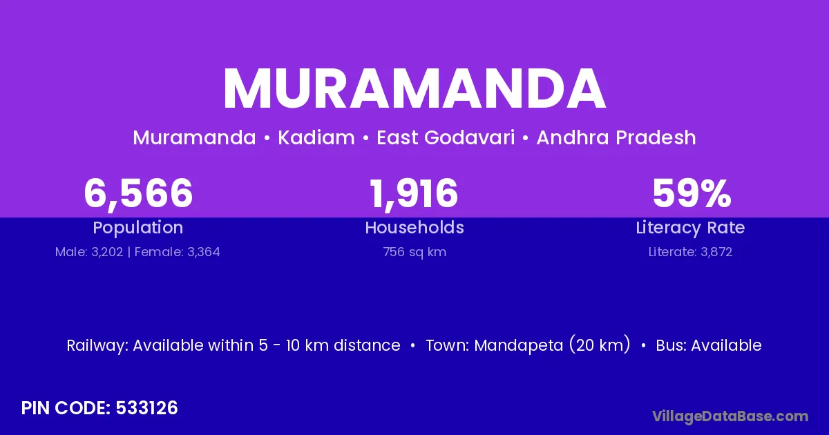 Mandapeta (20 km) is the nearest town to Muramanda village for major economic activities and is located approximately 20 km away.