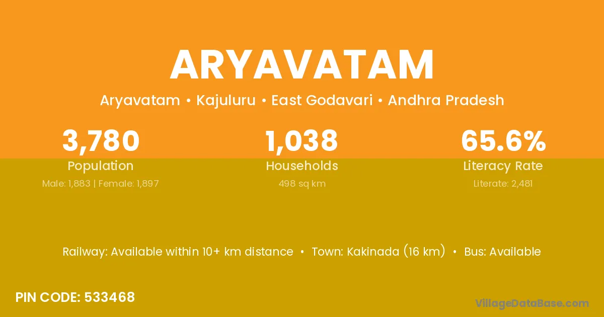 Aryavatam village has a total population of 3,780 people, of which 1,883 are males and 1,897 are females.