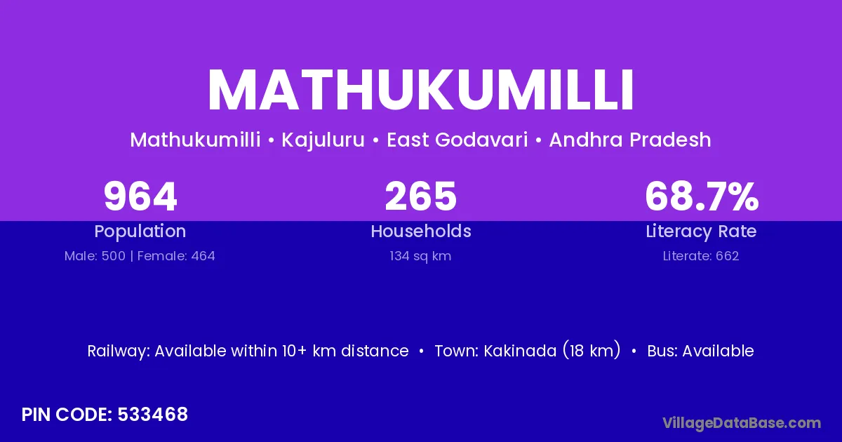 Kakinada (18 km) is the nearest town to Mathukumilli village for major economic activities and is located approximately 18 km away.