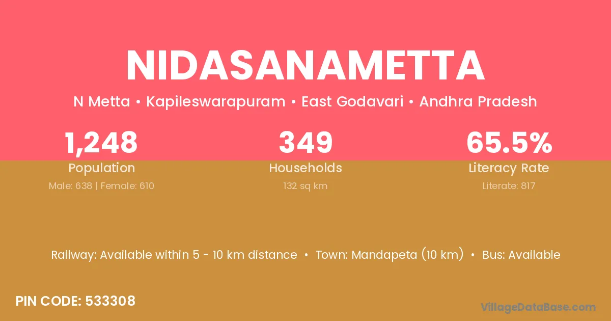 Nidasanametta village has a total population of 1,248 people, of which 638 are males and 610 are females.