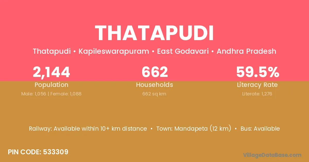 According to Census 2011 information, the village code of Thatapudi village is 533309.