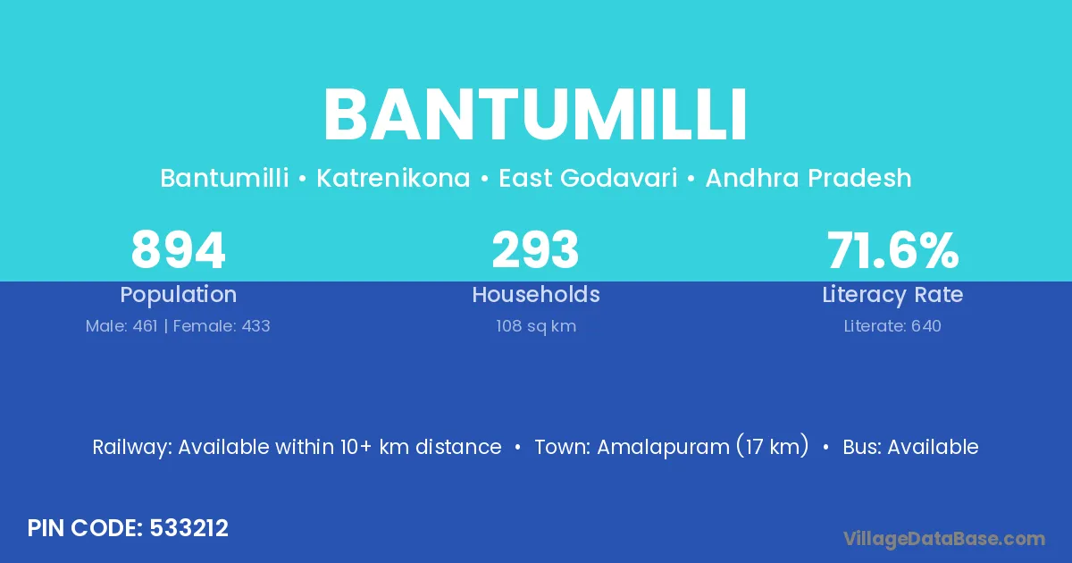 Amalapuram (17 km) is the nearest town to Bantumilli village for major economic activities and is located approximately 17 km away.