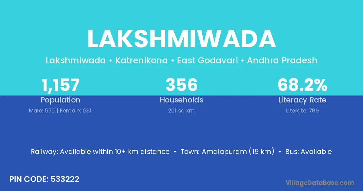 Amalapuram (19 km) is the nearest town to Lakshmiwada village for major economic activities and is located approximately 19 km away.