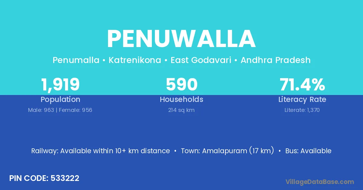 Amalapuram (17 km) is the nearest town to Penuwalla village for major economic activities and is located approximately 17 km away.