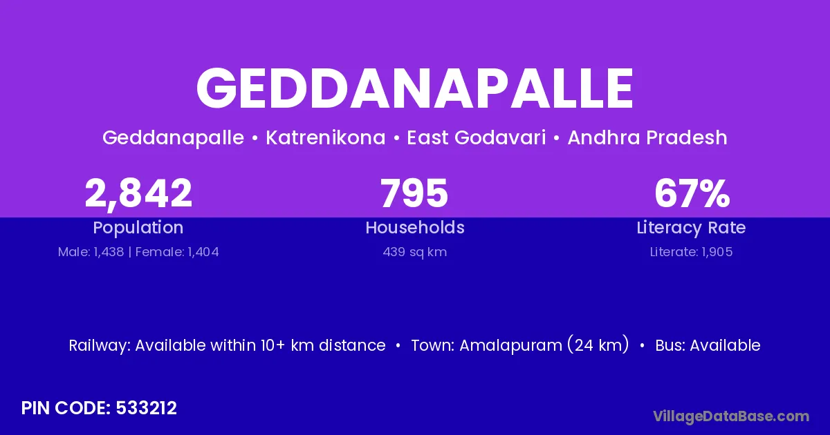 According to Census 2011 information, the village code of Geddanapalle village is 533431.